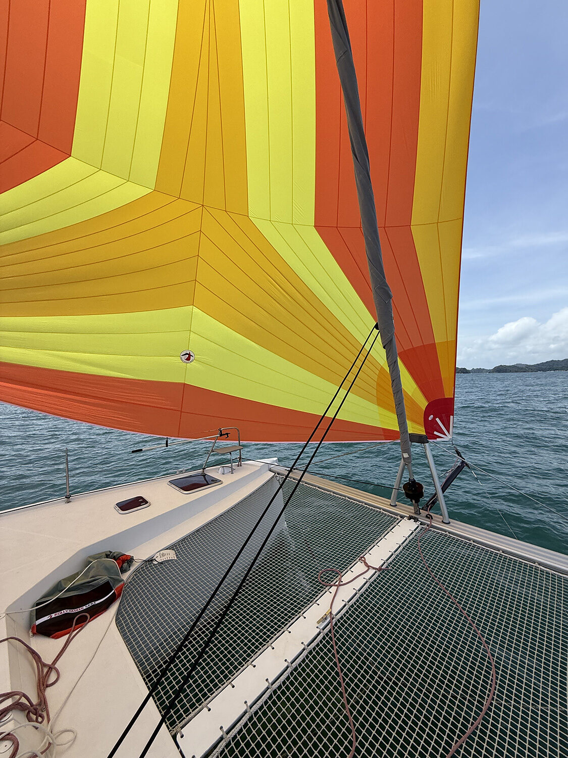 The Asymmetrical Spinnaker is ideal for multihulls. Setting, handling and dousing is safe and easy on the stable platform of the multihull deck, especially so with the Snuffer sock. The Asymmetrical Spinnaker can be set and flown without a spinnaker boom, which further simplifies handling. The sail is best used from about 100 degrees off the wind to straight downwind. In lighter winds, it can even be sailed wing-on-wing with the main. The sail is large and powerful and will certainly boost your downwind performance in winds of up to 16 knots TWS.