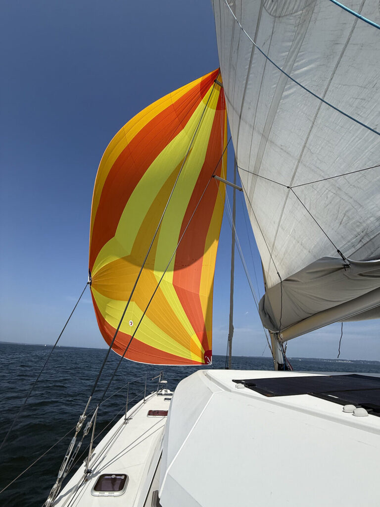 Using a sock for setting and dousing the sail makes it very easy. The sock is hoisted and only then the sail pulled out, which is especially easy when done in the wind shadow of the mainsail. It can easily be done single-handed. The same applies to dousing the sail – release the sheet, pull the sock over the sail and then take the resulting “tube” down onto the deck. This is necessary, in contrast to a furled Code Sail or Screecher which can be left furled and hoisted in front of the forestay in calmer conditions.